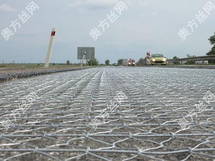 SL型路面加筋網(wǎng)由網(wǎng)孔型號8X10的雙絞合金屬網(wǎng)制成,并將橫向加筋棒以約400px的間距編織到網(wǎng)面中。