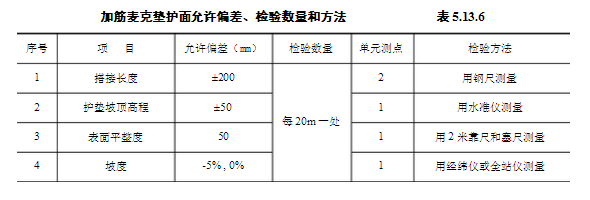 6 加筋麥克墊護面的允許偏差、檢驗數量和方法應符合表5.13.6規定。