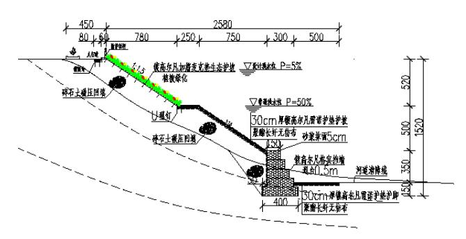 對于洪水位以上區域,除特殊情況外,基本不會(huì )受水流影響,故采用加筋麥克墊進(jìn)行防護,以防止水土流失,保護植被根系,利于植被生長(cháng),進(jìn)一步保證岸坡的綠化效果。